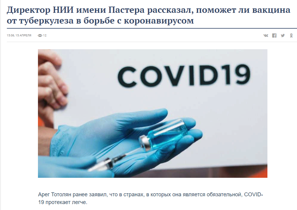 15 апреля 2020 г. директор Санкт-Петербургского НИИ эпидемиологии и микробиологии имени Пастера Роспотребнадзора, академик РАН Арег Артёмович Тотолян дал комментарий корреспонденту Телеканала «Санкт-Петербург» о том, может ли вакцина от туберкулёза помочь в борьбе с коронавирусной инфекцией.