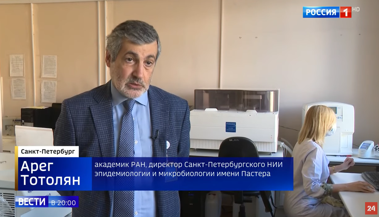 9 августа в эфире ГТК «Телеканал «Россия» в Программе «Вести» в сюжете о том, «как действует российская вакцина против коронавируса», в частности, говорилось о новых загадках иммунитета, которые изучают в Санкт-Петербургском НИИ эпидемиологии и микробиологии имени Пастера. Здесь анализируют данные на коллективный иммунитет, полученные в ходе масштабного эксперимента, проводимого в 26 регионах страны. В сюжете прозвучали комментарии директора Института, академика РАН, профессора, Арега Артёмовича Тотоляна.