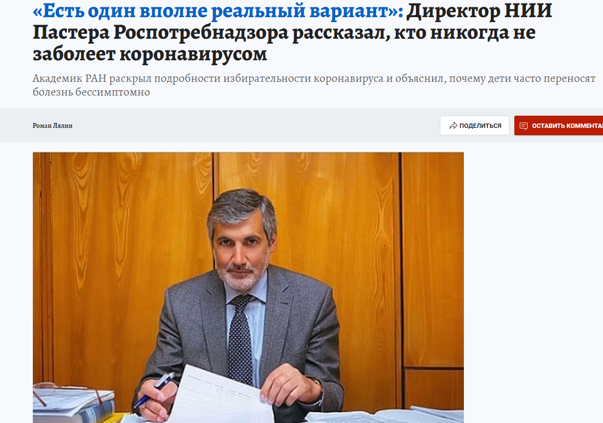11 августа на сайте «Комсомольской правды» вышло интервью с директором Санкт-Петербургского НИИ эпидемиологии и микробиологии имени Пастера, академиком РАН, профессором Арегом Артёмовичем Тотоляном, который отвечая на вопросы журналиста, рассказал о факторах, влияющих на возможность заражения коронавирусной инфекцией, о невосприимчивости некоторых людей к инфекции, о «тренированном иммунитете» и о мн. др.
