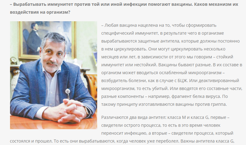 31 августа на страницах газеты «Вечерний Санкт-Петербург» вышло интервью директора Санкт-Петербургского НИИ эпидемиологии и микробиологии имени Пастера Роспотребнадзора, академика РАН, профессора, Арега Артёмовича Тотоляна. Учёный ответил на вопросы журналиста Светланы Яковлевой: как вырабатывается иммунитет против определенной инфекции; как вакцина влияет на человеческий организм и почему нужно вакцинироваться и др.