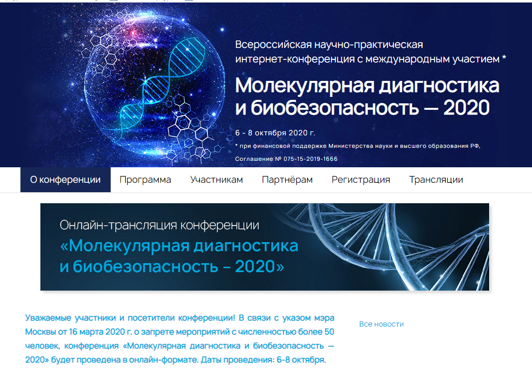 Всероссийская научно-практическая конференция с международным участием «Молекулярная диагностика и биобезопасность – 2020» прошла с 6 по 8 октября 2020 года в онлайн формате. В ходе работы трех дней конференции был рассмотрен широкий круг вопросов по актуальным вопросам молекулярной диагностики: биологические угрозы и система реагирования; молекулярно-генетические методы в эпидемиологии; изменения климата и инфекционная патология; молекулярные методы в выявлении резистентности. Один день работы был посвящен эпидемиологическим и клиническим исследованиям и лабораторной диагностике COVID-19.