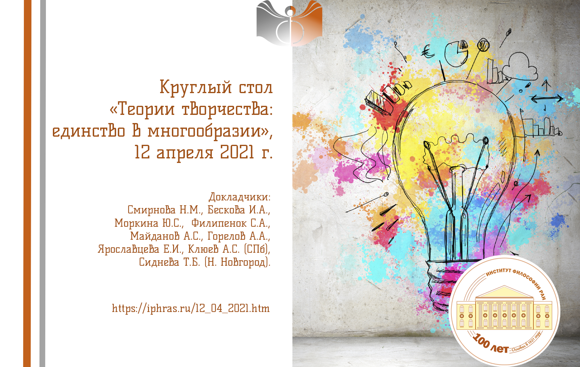 12 апреля в 14:00 в формате онлайн состоится круглый стол в рамках празднования столетия Института «Теории творчества: единство в многообразии». Участники круглого стола: Н.М. Смирнова, И.А. Бескова, Ю.С. Моркина, С.А. Филипенок, А.С. Майданов, А.А. Горелов, Е.И. Ярославцева, А.С. Клюев, Т.Б. Сиднева. Модератор – Н.М. Смирнова, уч. секретарь – С.А. Филипенок.
