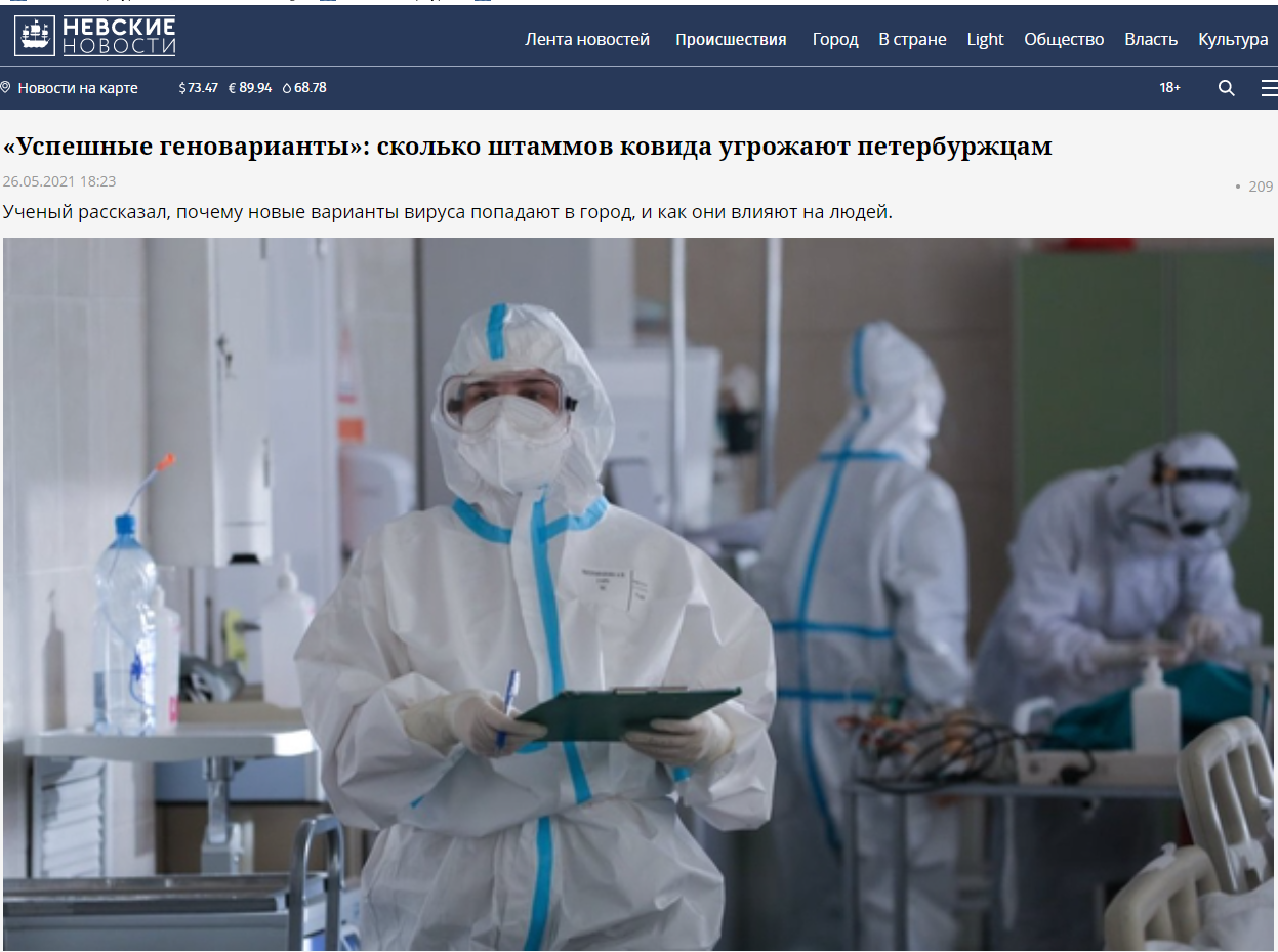 26 мая 2021 г. на сайте «Невские новости» вышло интервью с заместителем директора по научной работе Санкт-Петербургского НИИ эпидемиологии и микробиологии имени Пастера Роспотребнадзора Владимиром Георгиевичем Дедковым «Успешные геноварианты»: сколько штаммов ковида угрожают петербуржцам», в котором учёный рассказал, почему новые варианты вируса попадают в город, и как они влияют на людей.
