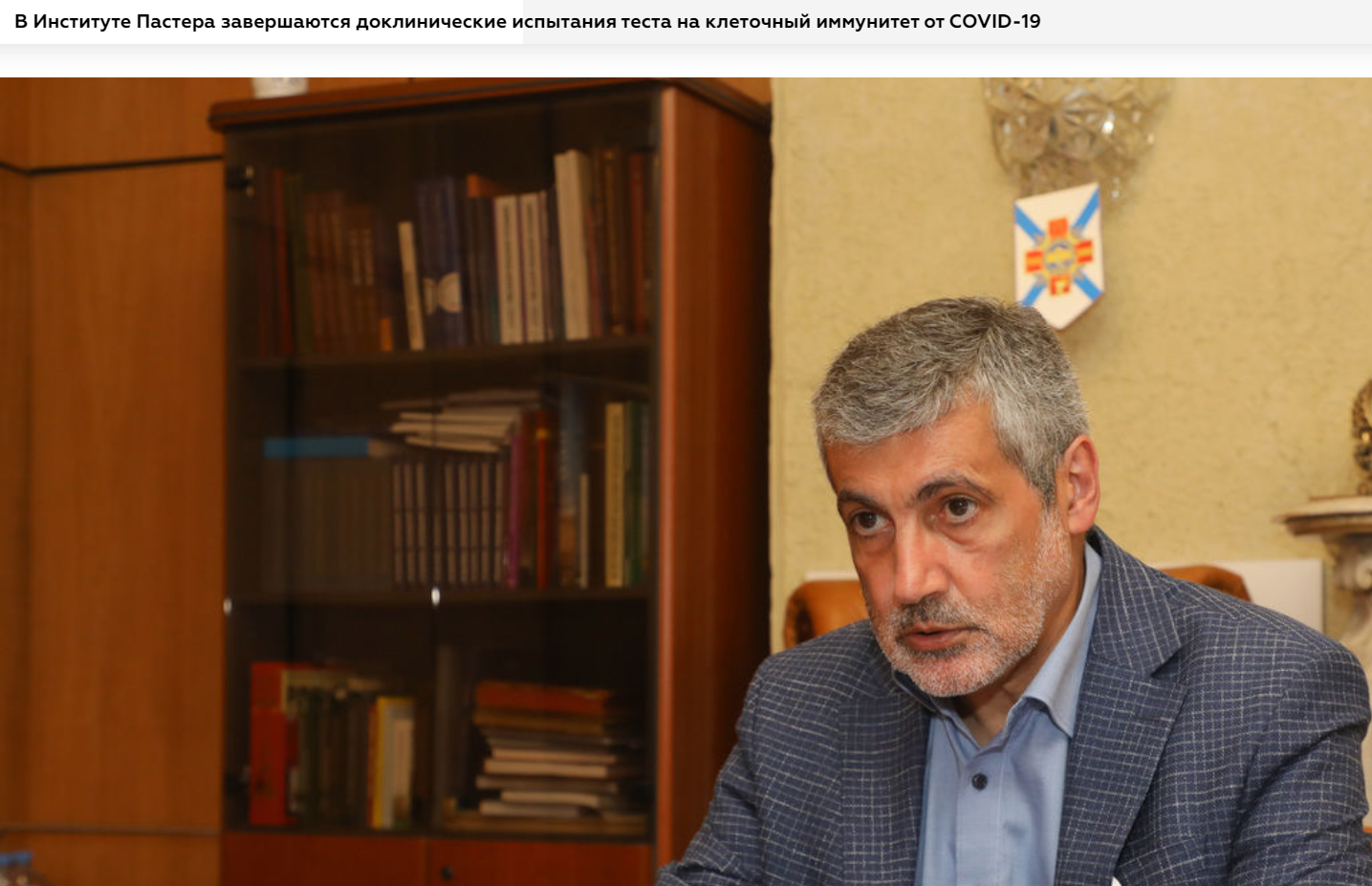 3 августа 2021 г. на сайте «Петербургского дневника» опубликована статья «В Институте Пастера завершаются доклинические испытания теста на клеточный иммунитет к COVID-19», в котором приведены выдержки из интервью директора Санкт-Петербургского НИИ эпидемиологии и микробиологии имени Пастера Роспотребнадзора, академика РАН Арега Артёмовича Тотоляна. Учёный объясняет, как будет работать тест на клеточный иммунитет к COVID-19, и как будут связаны его результаты с необходимостью делать или не делать прививку от коронавирусной инфекции.