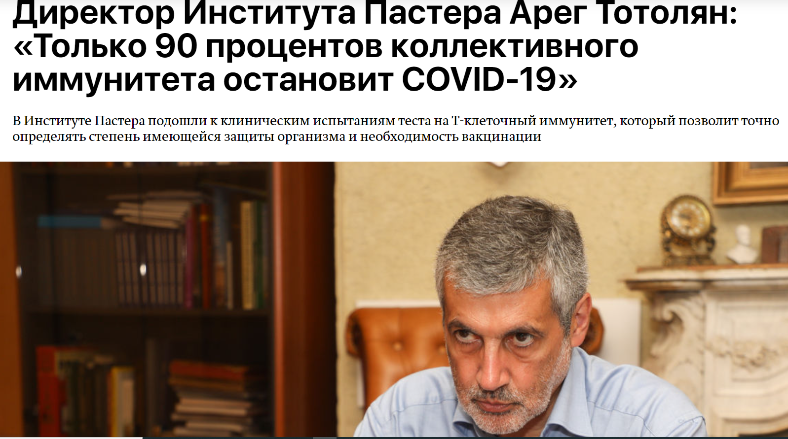 10 августа 2021 г. на сайте «Петербургского дневника» опубликовано интервью директора Санкт-Петербургского НИИ эпидемиологии и микробиологии имени Пастера Роспотребнадзора, академика РАН Арега Артёмовича Тотоляна. Учёный, отвечая на вопросы корреспондента, рассказал о создании в Институте теста на определение Т-клеточного иммунитета, который позволит определять уровень имеющейся защиты организма и необходимость вакцинации. О том, почему трети привитого населения страны недостаточно для победы над COVID-19 и как защищают нас антитела и др.