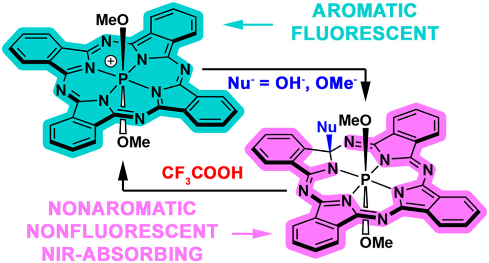 Ранее изученные методы модификации фталоцианинов сохраняли их ароматичность, но химикам удалось найти первый пример, когда она нарушается. Для этого в полость фталоцианинового кольца ввели атом фосфора, несущий большой положительный заряд. Благодаря этому получившиеся молекулы стали способны присоединять отрицательно-заряженные частицы – например, гидроксид-анионы, содержащиеся в щелочах, с образованием уникальных неароматических фталоцианинов. Вернуть им ароматичность позволяет введение в систему кислоты, при этом молекула полностью восстанавливает свои исходные свойства. Этот процесс может повторяться неоднократно.