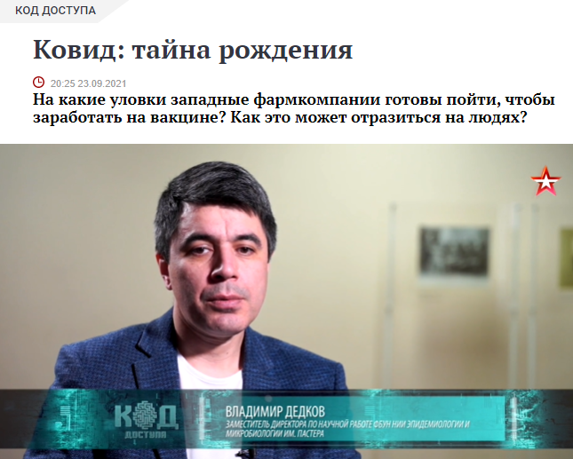 23 сентября 2021 г. в эфире ТК «Звезда» в Программе «Код доступа» демонстрировался репортаж «Ковид: тайна рождения». В репортаже, в частности, шла речь о расследованиях американских спецслужб, касающихся происхождения COVID-19, о миссии ВОЗ в Китай, о деятельности фармкомпаний и др. В репортаже использовались комментарии эксперта ВОЗ, заместителя директора по научной работе Санкт-Петербургского НИИ эпидемиологии и микробиологии имени Пастера Роспотребнадзора Владимира Георгиевича Дедкова.