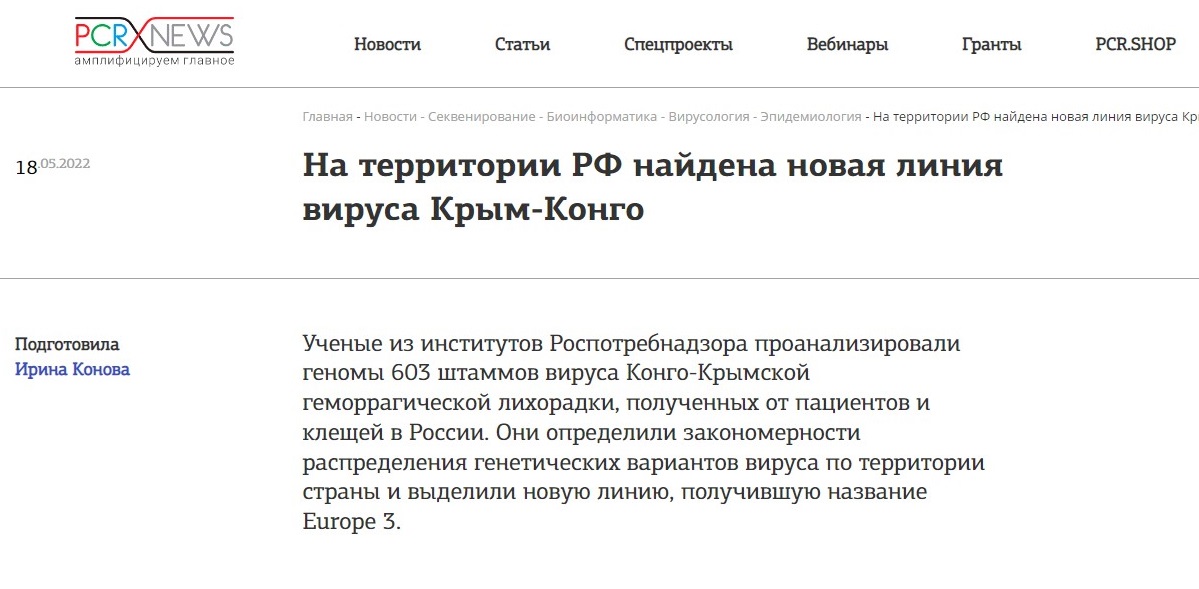 18 мая 2022 г. на сайте PSR.news размещён материал «На территории РФ найдена новая линия вируса Крым-Конго», в котором приводится статья о молекулярной эпидемиологии вируса Конго-Крымской геморрагической лихорадки в России, опубликованная учёными Санкт-Петербургского НИИ эпидемиологии и микробиологии имени Пастера, Ставропольского противочумного института и ЦНИИ эпидемиологии о молекулярной эпидемиологии в PLoS ONE.