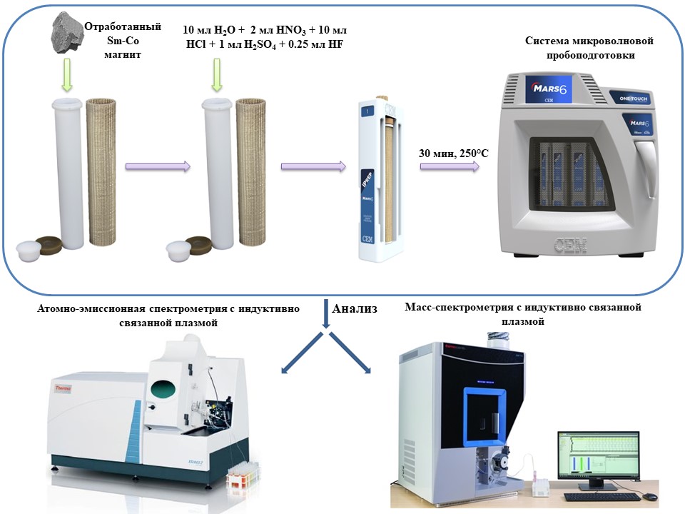 Исследователи из ИОНХ РАН впервые разработали методику определения содержания цветных и редких металлов в отработанных самарий-кобальтовых магнитах методами масс-спектрометрии и атомно-эмиссионной спектрометрии с предварительным растворением образцов с использованием метода микроволновой пробоподготовки. Были изучены и выбраны параметры микроволнового растворения образцов, а также выбраны концентрации кислот для полного перевода основных компонентов в раствор.