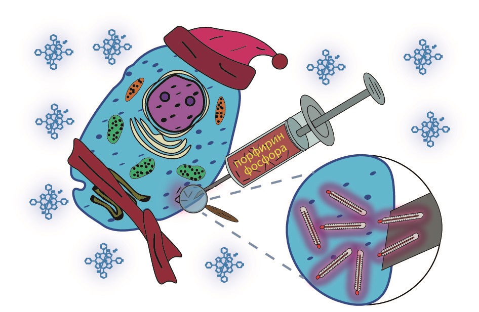 Коллектив авторов из Москвы и Санкт – Петербурга впервые на основе соединений порфиринов фосфора синтезировали люминесцентный термодатчик, который может работать непосредственно в живой клетке и определять температуру с точностью до 0.1oC. При этом параллельно был обнаружен простой способ доставки молекул порфиринов в клетку. Хорошо известно, что многочисленные соединения класса порфиринов применяются в качестве препаратов для фотодинамической терапии опухолей, а также антибактериальной терапии. Необходимым условием для их использования является водорастворимость, которая обычно достигается за счет сложных синтетических подходов. Авторы работы показали возможность эффективного решения этой задачи за счет введения в молекулы катиона фосфора(V).