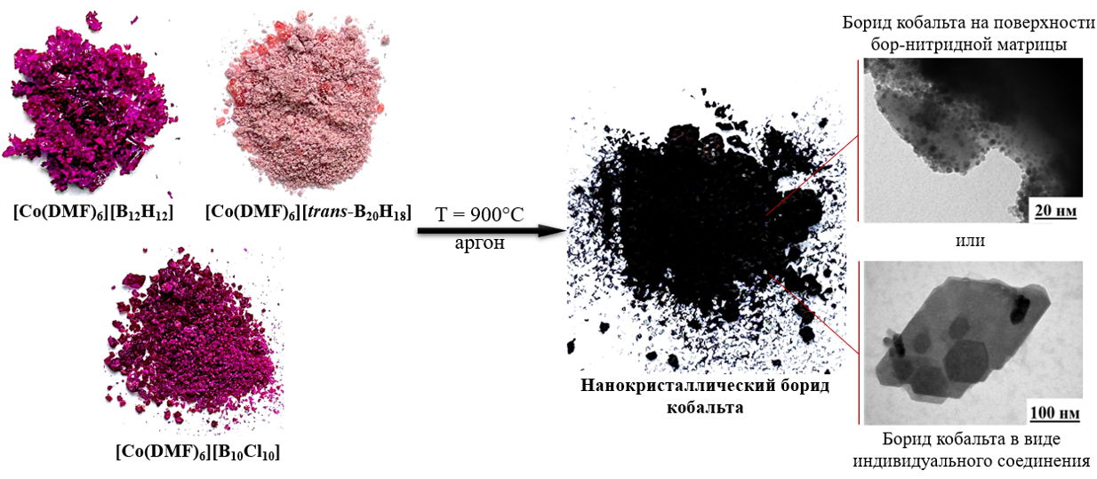 Московские химики предложили получать бориды металлов из координационных соединений, содержащие энергоемкие кластерные анионы бора, что позволило заметно снизить температуру термической обработки. «Предложенный нами метод основан на термическом разложении координационных соединений кобальта с кластерными анионами бора при 900°C в атмосфере аргона. В результате нам удалось в одну стадию получить нанокристаллический борид кобальта размером до 35 нм с распределением частиц по размерам, что является ключевым фактором для использования этого материала в катализе. При этом мы обнаружили, что варьирование природы используемого кластерного аниона бора (количество атомов бора в составе кластера, наличие различных функциональных групп) может влиять как на фазовый состав, так и на структурные особенности образующегося моноборида кобальта. В частности, можно получить наночастицы борида кобальта на поверхности бор-нитридной матрицы или в виде индивидуального соединения. Это расширяет круг потенциальных применений и возможности масштабирования получения борида кобальта» - рассказала доктор химических наук Елена Анатольевна Малинина, главный научный сотрудник Лаборатории химии легких элементов и кластеров ИОНХ РАН.