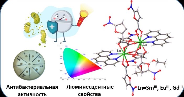 Химики из ИОНХ РАН, ИНЭОС РАН, совместно с биологами из ИОГен и УрНИИ Фтизиопульмонологии и физиками из ФИАН синтезировали комплексы европия, самария и гадолиния с фуранкарбоновыми кислотами и фенантролином, которые обладают высокой антибактериальной активностью in vitro против непатогенного микобактериального штамма (M.smegmatis) и патогенного M.tuberculosis. а также проявляют интенсивную фото-люминесценцию.