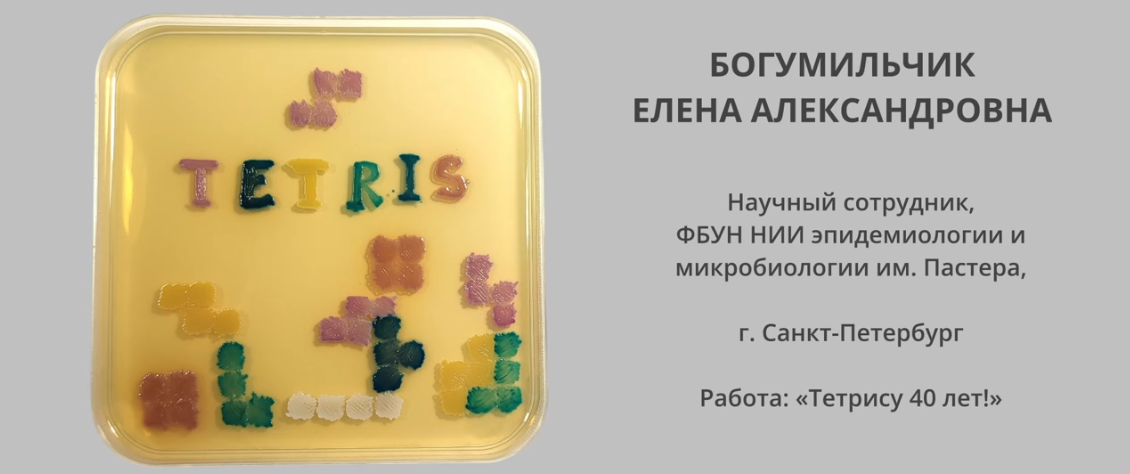 В 2024 году тема Конкурса картин из микроорганизмов звучала так: «Назад в 80-е». Участники прислали более 100 работ. Среди победителей конкурса – тех, кто сумел соединить науку и искусство в одном великолепном творении – научный сотрудник лаборатории медицинской бактериологии Института Богумильчик Елена Александровна. За свою работу «Тетрису 40 лет» учёная удостоена почётного 3-го места.