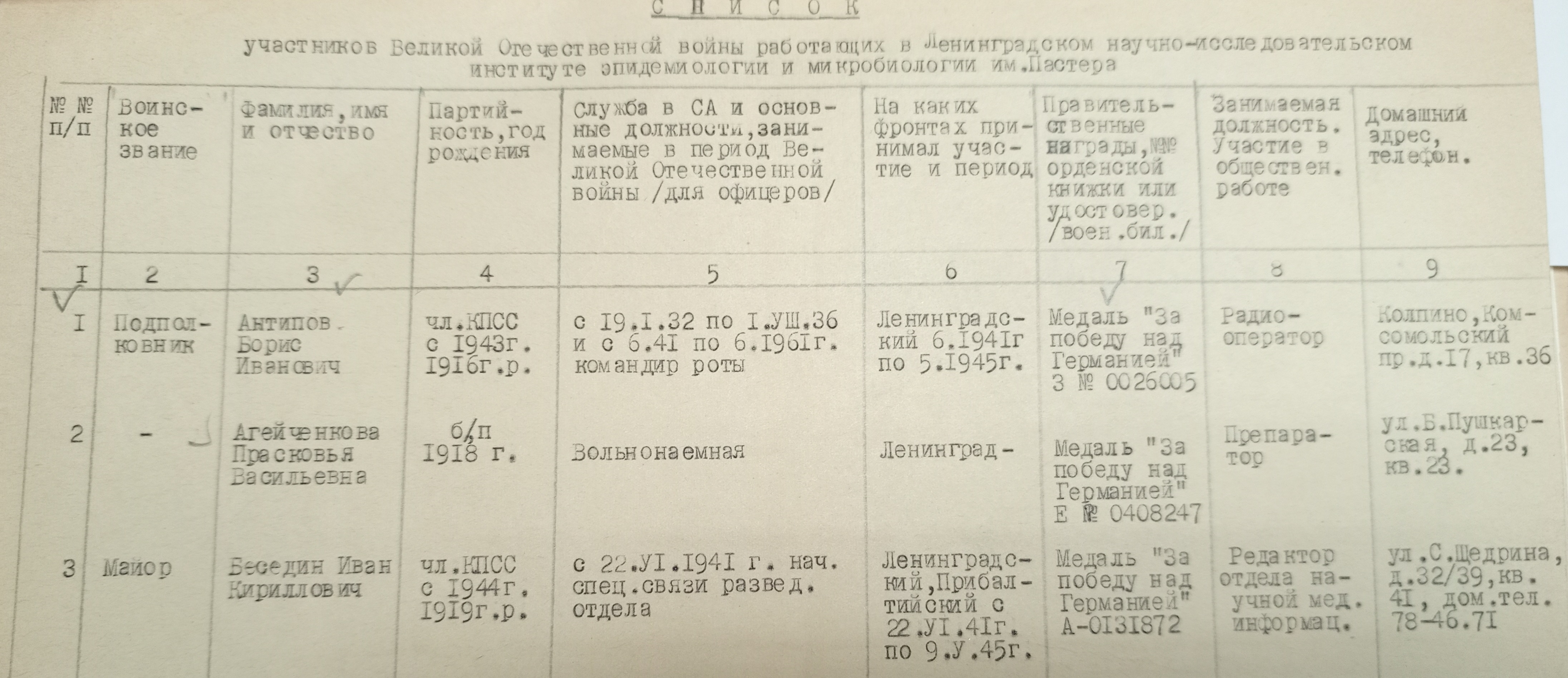 В архивах Института обнаружен уникальный документ «Список участников Великой Отечественной войны, работающих в Ленинградском научно-исследовательском институте эпидемиологии и микробиологии им. Пастера». К сожалению, не указана точная дата формирования списка. Со всей очевидностью можно лишь сказать, что это период с 1971 по 1992 гг., когда директором Института был Перадзе Тамаз Владимирович, подпись которого визирует документ.