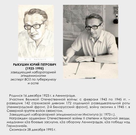 О послевоенных буднях своих коллег, трудившихся в Институте в разные годы, П.М. Вячкилев рассказывает в своих работах. Большинство из них, выполненные в шутливой манере в виде шаржей, по-видимому, создавались для стенгазет и капустников. Но кроме того, художник написал и несколько портретов. Среди них – портрет Юрия Петровича Рыкушина, участника Великой Отечественной войны, разведчика 142-й стрелковой дивизии 172-й отдельной разведывательной роты (Ленинградский фронт, 2-й Белорусский фронт), награждённого орденами Отечественной войны II степени и «Красной звезды», медалями «За боевые заслуги», «За оборону Ленинграда», «За победу над Германией» и др.