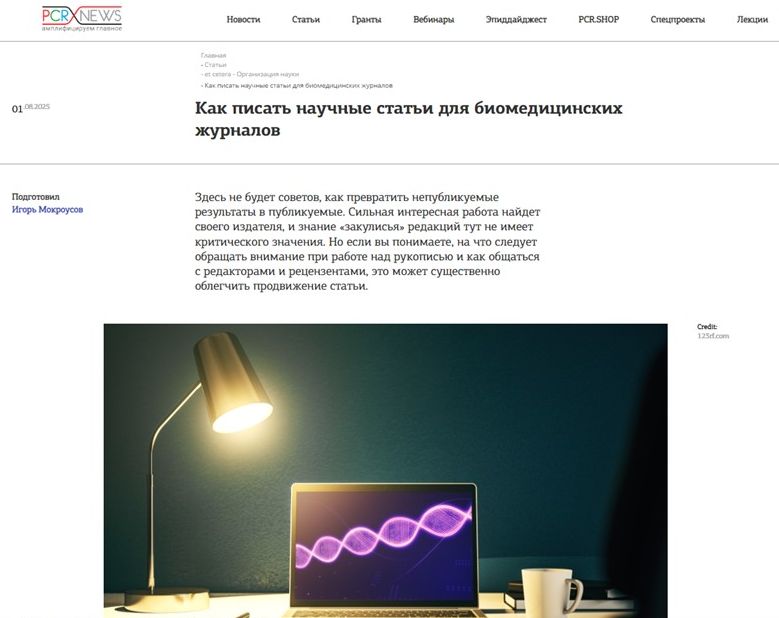 31 июля 2025 г. портал научных новостей PCR.NEWS опубликовал статью заведующего лабораторией молекулярной эпидемиологии и эволюционной генетики института, д.б.н. Игоря Мокроусова «Как писать научные статьи для биомедицинских журналов».