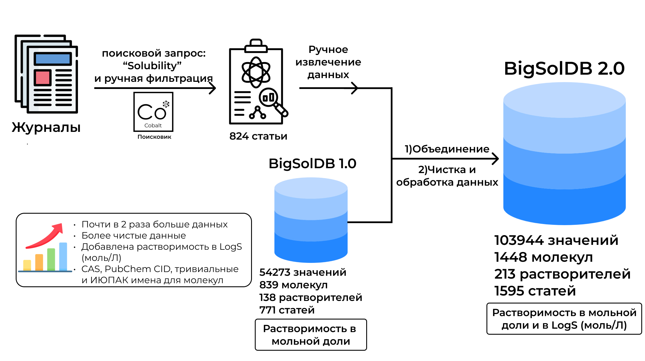 Растворимость является одним из ключевых свойств органических соединений, определяющих их применение в химии, материаловедении и фармацевтике. Однако, предсказание значений растворимости в любом растворителе, кроме воды, остается сложной задачей в современной хемоинформатике, не в последнюю очередь из-за отсутствия больших и разнообразных наборов данных. Для решения этой задачи целесообразно использовать методы машинного обучения, которые позволяют предсказывать свойства химических соединений без необходимости в экспериментальных образцах. Это делает процесс оценки, например, растворимости, значительно быстрее и дешевле. Кроме того, использование большой и качественной базы данных улучшает точность прогнозов и повышает надёжность полученных результатов, открывая возможности для масштабного скрининга новых соединений.