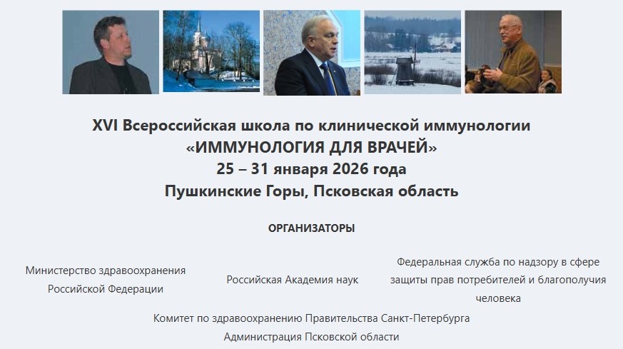 25 января 2026 г. в Пушкинских Горах в Псковской области начнёт свою работу ХVI Всероссийская Школа по клинической иммунологии «Иммунология для врачей». В Программе Школы лекции ведущих российских иммунологов и зарубежных специалистов, семинары по практическим вопросам иммунологии, симпозиумы, круглые столы и мастер-классы.