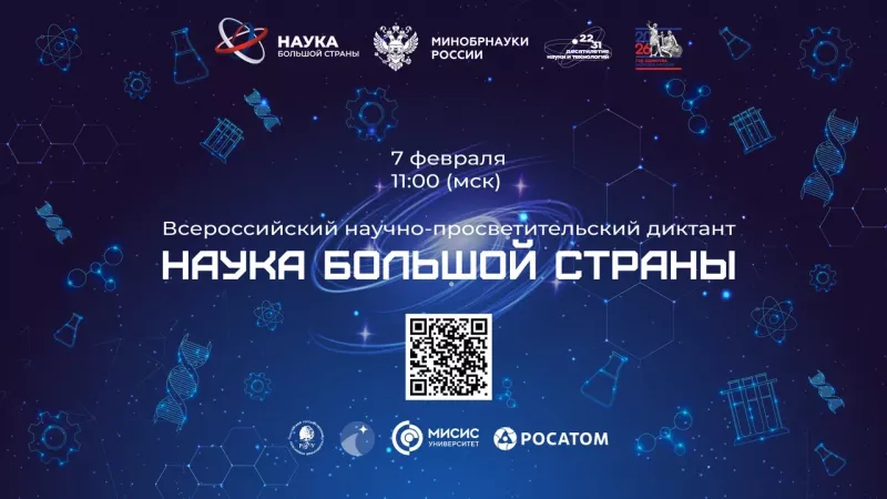 7 февраля 2026 г. с 11:00 до 12:00 пройдет Всероссийский научно-просветительский диктант «Наука большой страны», посвящённый популяризации научных достижений народов России и направленный на формирование и укрепление национального технологического и индустриального суверенитета страны.