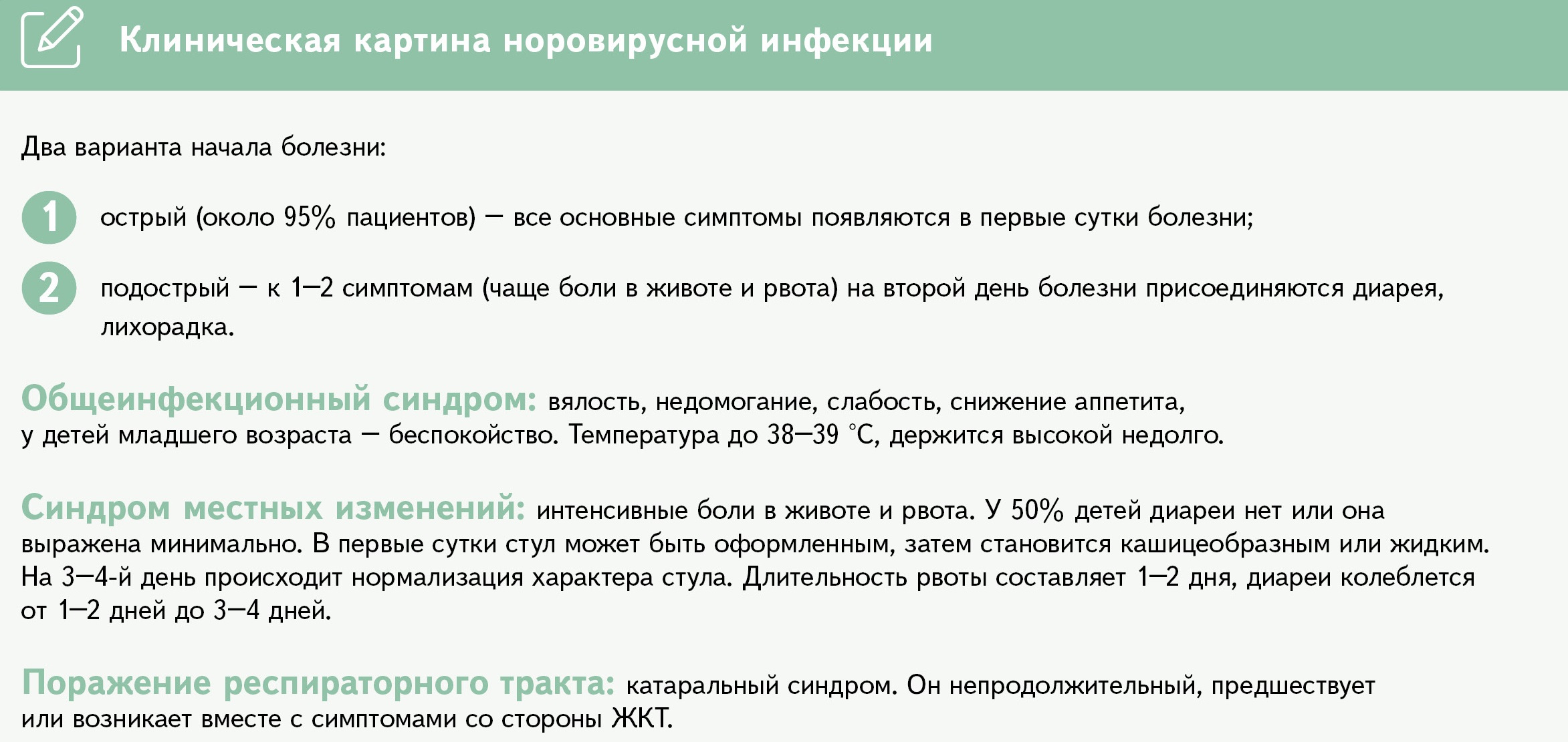 Первые симптомы заболевания появляются через 24-48 ч. после заражения. Это может быть однократная, но чаще многократная рвота, понос, сильная тошнота, повышение температуры. Норовирус чаще всего вызывает диарею и сильную рвоту, но иногда может быть и только рвота. Нарушения со стороны пищеварительной системы могут сопровождаться мышечными, головными болями и слабостью. Обычно симптомы норовирусной инфекции проходят сами через 12-72 часа. После болезни организм вырабатывает иммунитет к вирусу, но на очень короткий период, около 8 недель. После этого срока человек может снова заразиться норовирусом и заболеть.