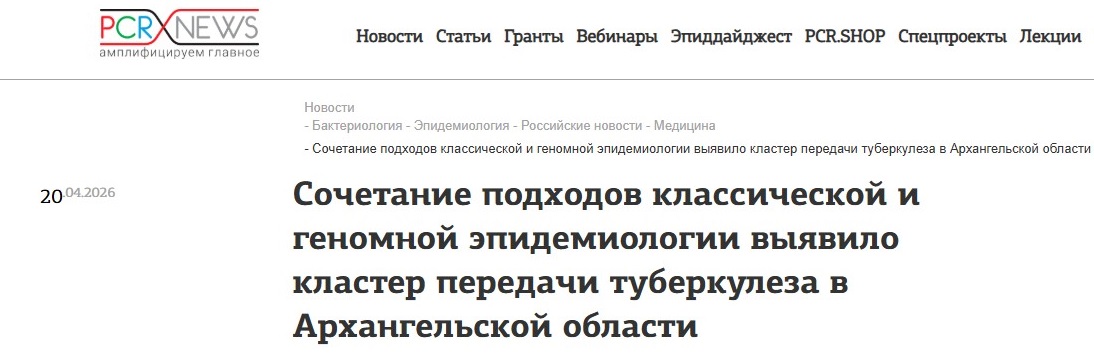 20 апреля 2026 г. научный новостной портал PCR.NEWS опубликовал материал «Сочетание подходов классической и геномной эпидемиологии выявило кластер передачи туберкулеза в Архангельской области». В ней рассказано о новой статье в журнале «Microbiology Spectrum», соавторами которой являются Анна Вязовая, Игорь Мокроусов и Дмитрий Полев.