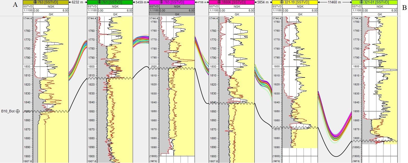 В ИНГГ СО РАН развивают методы стохастического моделирования залежей нефти и газа. Стохастическое моделирование залежей позволяет ученым лучше узнать геологическое строение недр, оптимизировать освоение месторождения и оценить возможные инвестиционные и технологические риски. При создании пространственных моделей пластовых залежей нефти и газа специалисты первым делом проводят корреляцию разрезов скважин – иначе говоря, отождествление в них одинаковых пластов. На примере ботуобинского горизонта Чаяндинского месторождения сотрудники ИНГГ СО РАН впервые показали, что можно получить многовариантные корреляционные построения и включить их в схему стохастической оценки пластовых залежей нефти и газа. Для корреляции разрезов скважин специалисты использовали алгоритм DTW и собственную разработку ИНГГ СО РАН – плагин MultiWellCorrelation для программного пакета Petrel от Schlumberger.