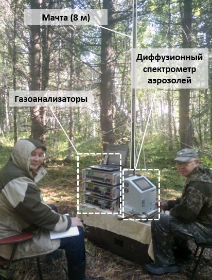 В июле-сентябре 2020 г. в рамках выполнения темы государственного задания ИФМ СО РАН № АААА-А17-117121140006-0 и РФФИ № 19-05-50005_Микромир сотрудниками лаборатории дистанционного зондирования атмосферы проведены комплексные экспериментальные исследования аэрозольно-газовых примесей, метеорологических, радиационных и динамических характеристик атмосферы оз. Байкал в режиме мониторинга на научном стационаре «Боярский». Большое внимание в полевых условиях было уделено определению источников аэрозольных частиц нанометрового диапазона в атмосфере с целью выявления закономерностей, происходящих в природе, от случайных событий. Определение концентрации и спектра размеров микродисперсных аэрозольных частиц впервые проведено с помощью диффузионного спектрометра аэрозолей ДАС 2702 М фирмы «AeroNano Tech», приобретенного за счет средств гранта РФФИ. Спектрометр имеет три режима работы: режим измерений параметров аэрозольных частиц в размерном диапазоне от 0,01 до 0,2 мкм; режим измерений параметров аэрозольных частиц в размерном диапазоне от 0,2 до 10 мкм; режим измерений общей счетной концентрации аэрозольных частиц. В результате проведённых измерений создан банк данных круглосуточных измерений дисперсного состава атмосферы при разных синоптических, метеорологических условиях. С использованием отработанной методики градиентных измерений проведены эксперименты по исследованию характеристик обменных процессов газовых примесей (потоки и скорости сухого осаждения) между атмосферой и подстилающей поверхностью. Для организации и проведения экспериментальных исследований характеристик газообменных потоков между атмосферой и лесной растительностью были подготовлены и инсталлированы две измерительные площадки с высотными мачтами 16 м (площадка №1) и 8 м (площадка №2) в лесном массиве.
