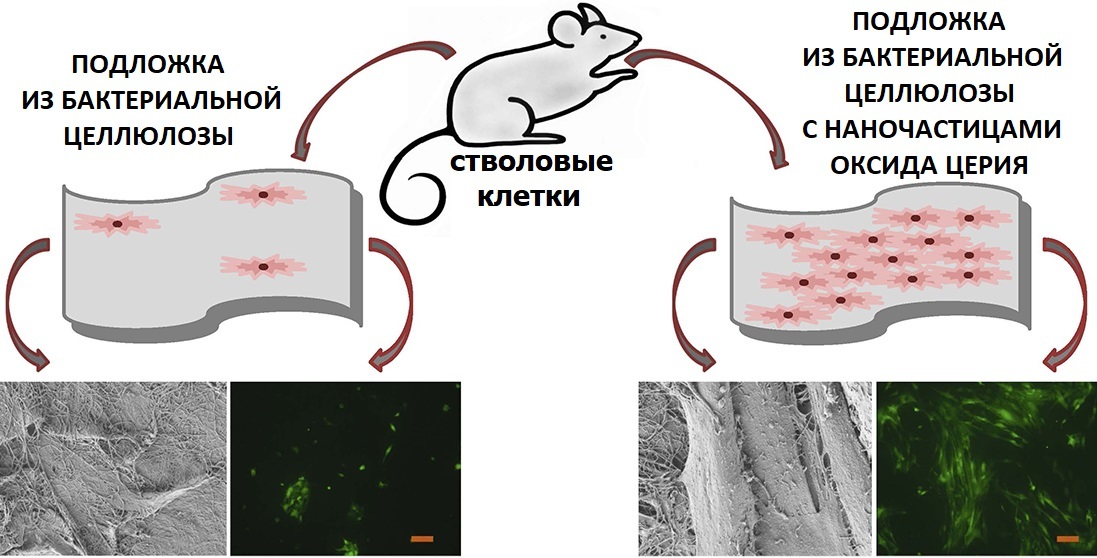 Международный коллектив авторов из Санкт-Петербурга, Пущино, Москвы и Минска предложил новую технологию создания подложек для роста стволовых клеток. Такие подложки предлагается создавать на основе бактериальной целлюлозы, модифицированной наночастицами оксида церия, которые придают ей уникальную биоактивность и обеспечивают ускоренное деление стволовых клеток на ее поверхности.